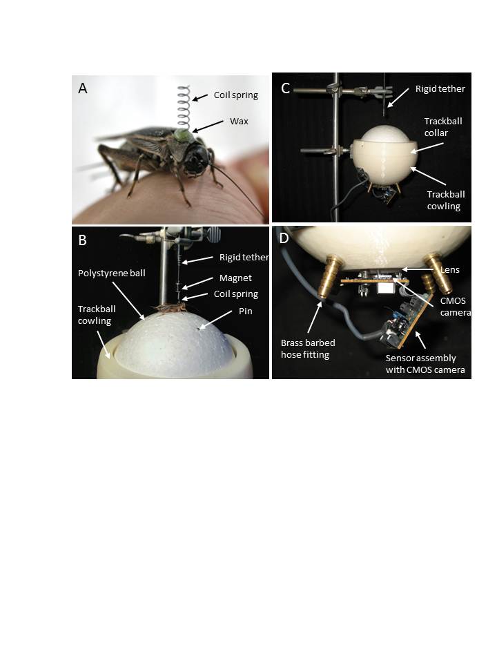 A styrofoam ball(c. 15 cm diameter) is suspended on a cushion of air within a 3D printed cowling so that the ball is free to rotate without friction in any direction. A suspended insect able to touch the ball is thus able to rotate the ball as it attempts to fictively walk or run. Sensors detect the speed and direction of rotation of the ball. Custom software (Contact Dr. Dawson) collects the data and calculates useable metrics of locomotor performance.